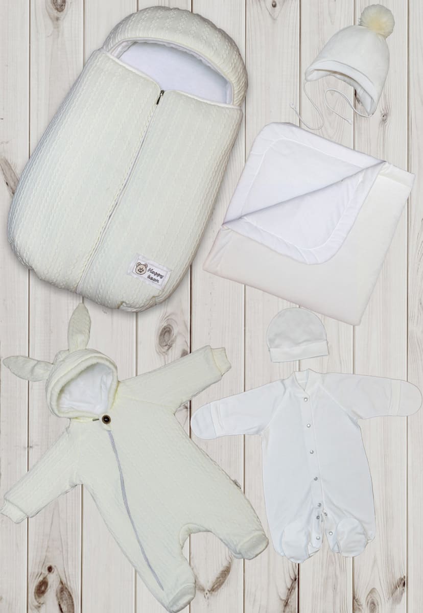 Комплект на выписку Балуша «Зефир» – стильный и тёплый набор из 6 предметов, разработанный специально для зимы и прохладного межсезонья. Этот набор включает в себя конверт на синтепоне, одеяло на синтепоне, комбинезон на синтепоне, легкий трикотажный комбинезон, теплую шапочку и трикотажную шапочку.